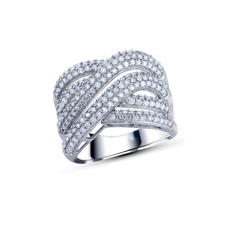 Immerse yourself in sophistication with our 18k White Gold Crossover Ring, a stunning piece that reflects timeless elegance. Weighing 7.95 grams, this ring features 1.42ct of dazzling Pave diamonds. Its crossover design offers a modern and refined style that will not go unnoticed. Available in size 13, this ring is a statement of luxury and distinction. Crafted with high quality 18k white gold and H color and SI clarity diamonds, it is the perfect choice to add a touch of sparkle and elegance to any ensemble.