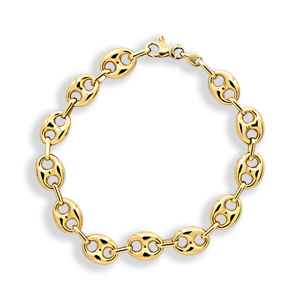 This calabrot bracelet is the ideal piece to stand out and capture everyone's attention, thanks to its elegant design. It is made of 18K gold. This jewel is a medium-sized calabrot link bracelet with lobster clasp, suitable for decorating hands and highlighting their natural beauty on any occasion, whether a formal meeting or a more casual event.
