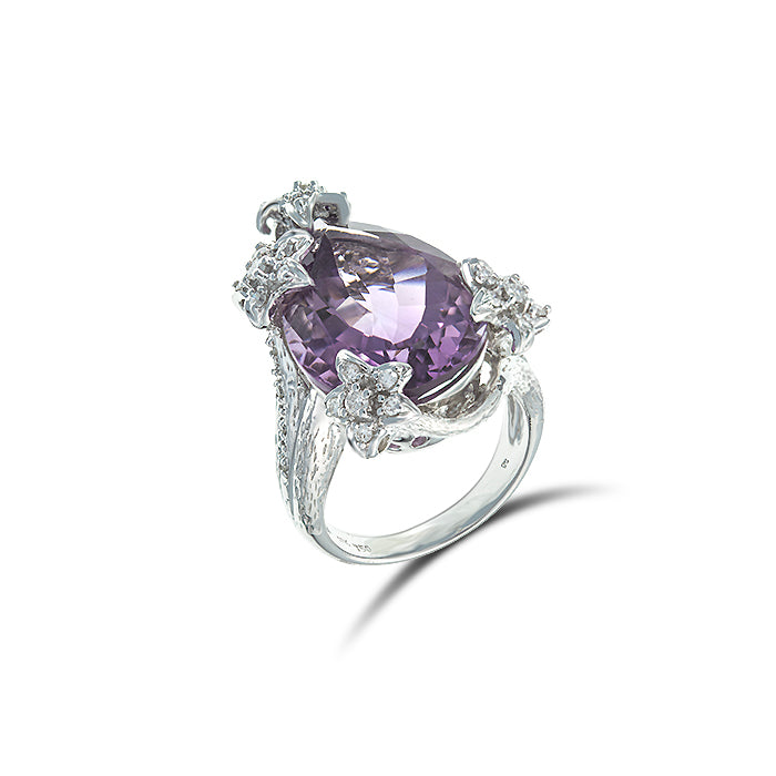 Adéntrate en un mundo de fantasía y elegancia con el Anillo Jardín de Amatistas, una joya que florece en tu mano con un brillo único y sofisticado. Forjado en oro blanco de 18 quilates, este anillo destaca por su imponente amatista natural de 14,10 quilates, tallada en forma de lágrima para capturar la luz con cada movimiento. Rodeando a esta majestuosa gema, delicadas flores de diamantes naturales de 0,42 quilates realzan el diseño con su destello sutil y refinado. Cada curva, cada detalle evoca un jardín encantado, donde la feminidad, la belleza y la exclusividad florecen en perfecta armonía. Este anillo es una obra maestra que transforma cualquier momento en una celebración de tu estilo único. Haz tuyo el lujo de llevar un jardín eterno en tus manos.